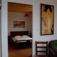 Under the roof, accessible by a spiral staircase, the is a mezzanine with a surface of 35m2, ideal for 2 children. The prix per night is €20,– , inclusive breakfast. This entresol can only be hired with one of the rooms, Pouilly Fuissé of Saint Véran.