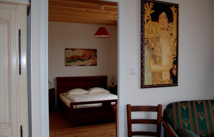 Under the roof, accessible by a spiral staircase, the is a mezzanine with a surface of 35m2, ideal for 2 children. The prix per night is €20,– , inclusive breakfast. This entresol can only be hired with one of the rooms, Pouilly Fuissé of Saint Véran.